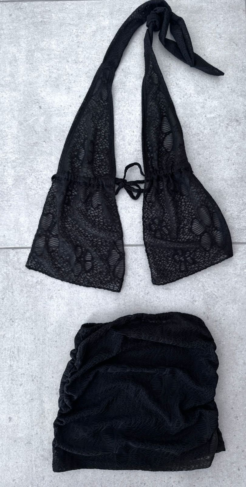 El diseño destaca por un escote drapeado con caida natural en el busto que aposta volumen y movimiento. La estructura se sostiene mediante tiras finas regulables que se extiende hacia la espalda y hacia el cuello, permitiendo un ajuste personalizado.