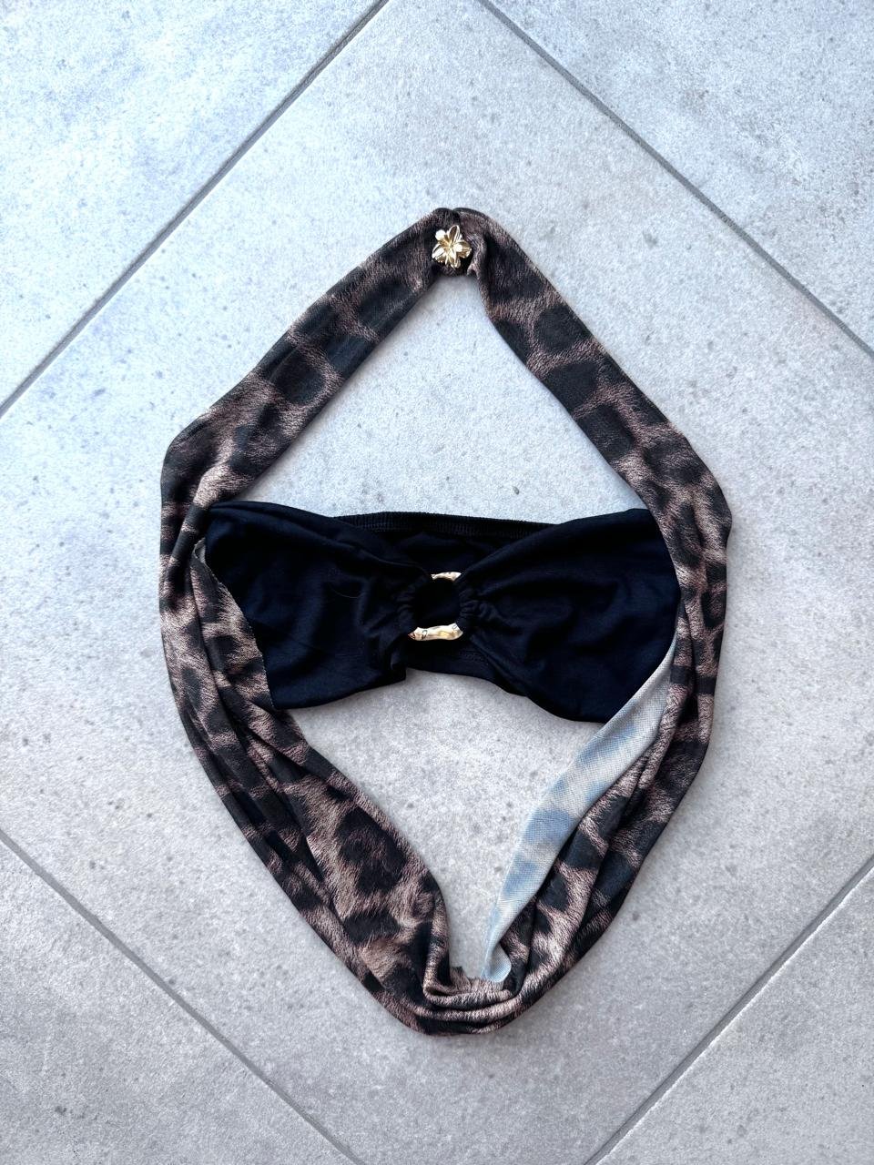 Caída fluida asimétrica tela animal print que rompe la sobriedad del negro. Este drapeado añade movimiento, textura, y un toque exótico que estiliza visualmente el torso.
